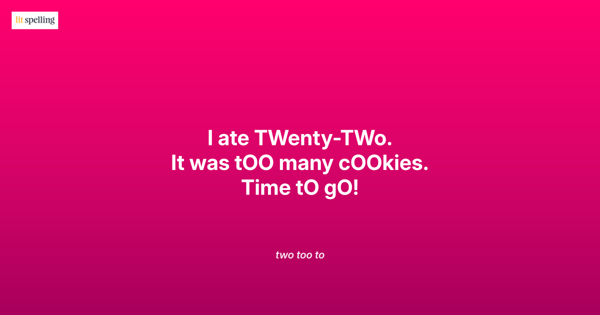 When you’re writing and pause at to/too/two, picture the cookie scene. Are you counting a number? (TWO has TW like TWenty). Talking about excess or addition? (TOO has double OO like tOO much). Or showing direction/purpose? (TO has single O like gO). The cookie scene gives you all three at once: a countable number (22), an excessive amount (too many), and a direction (to go).